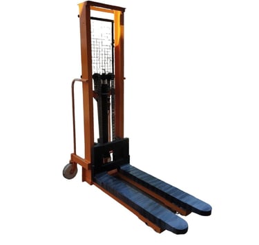 A semi-electric stracker combines manual maneuverability with electric lifting power. Operators use the hand controls to raise and lower pallets, reducing strain and fatigue.